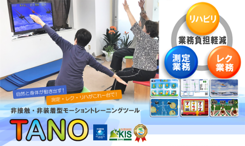 TANOTECH株式会社の「モーショントレーニングシステム」200種類以上の運動・発声・脳活性化コンテンツでトレーニングや各種測定を行います。